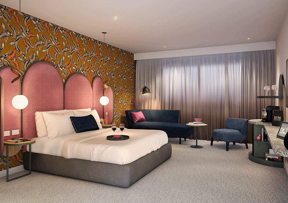 The interior design for the new hotel’s 103 rooms focus on creating a whimsical oasis for guests, replete with playful and colourful elements and commissioned art pieces, including custom wallpaper and eccentric furniture and illustrations.